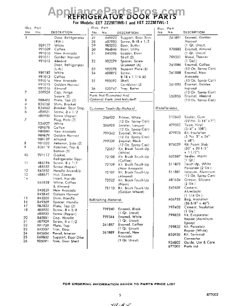 Parts for Whirlpool EET222MTWR1: 05 - Lit / Optional Parts
