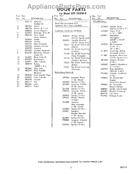 Parts for Whirlpool EEV163FW0: 05 - Lit / Optional Parts
