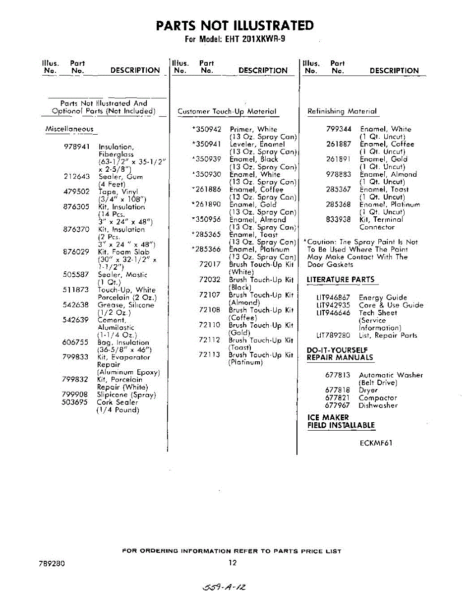 Parts for Whirlpool EHT201XKWR9: 12 - Lit / Optional Parts