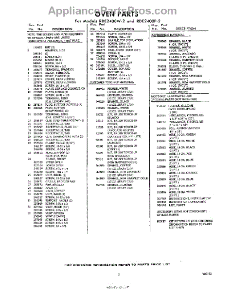 Parts for Whirlpool RDE2400W2: 03 - Lit / Optional Parts