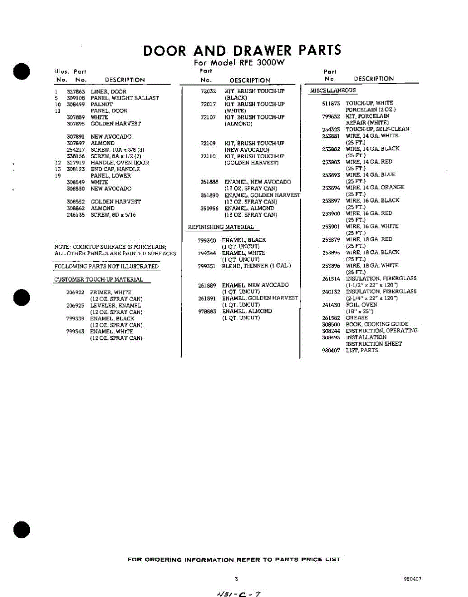 Parts for RFE3000W