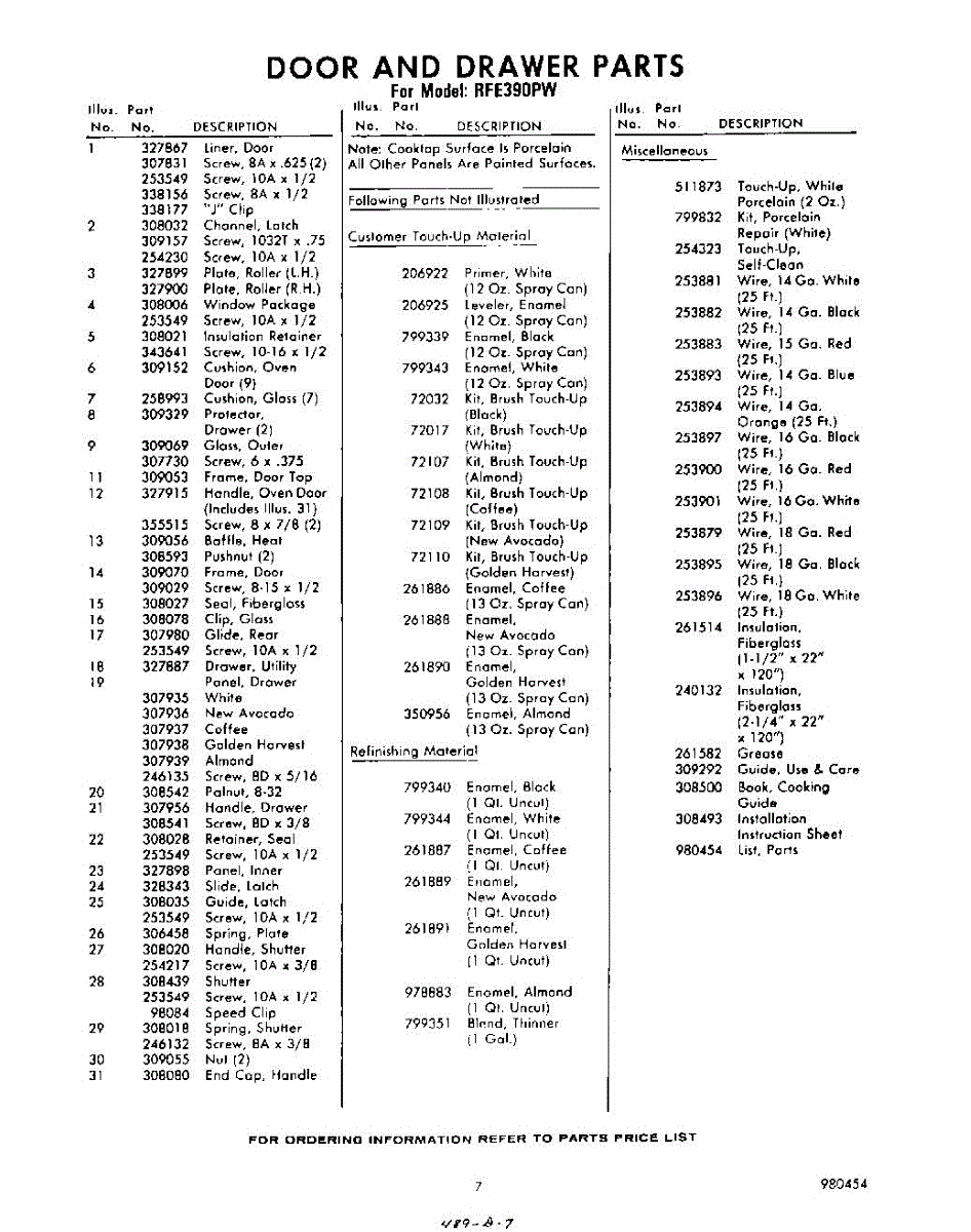 Parts for RFE390PW