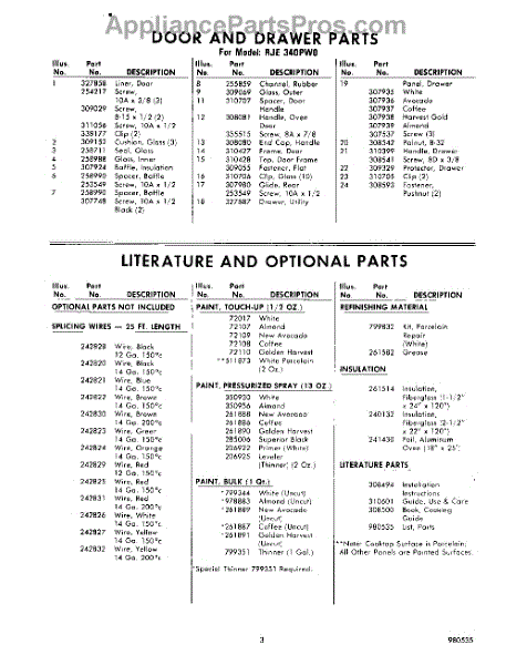 Parts for Whirlpool RJE340PW0: 03 - Lit / Optional Parts