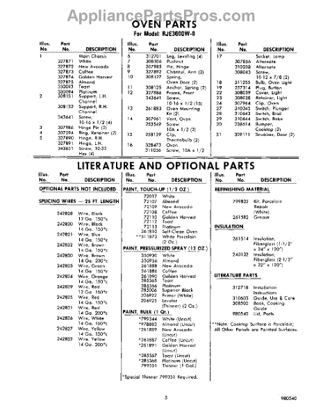 Parts for Whirlpool RJE3600W0: 05 - Lit / Optional Parts