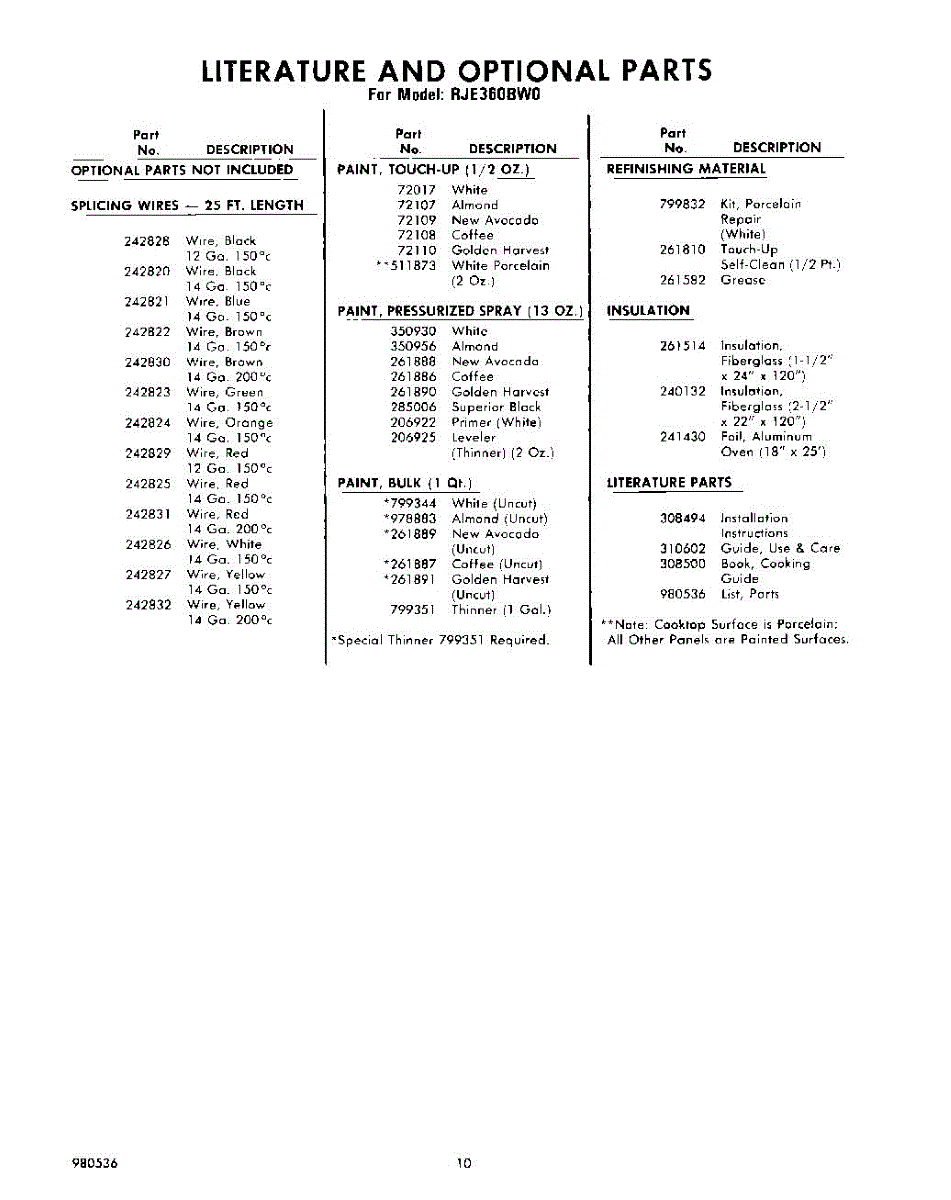 Parts for Whirlpool RJE360BW0: 10 - Lit / Optional Parts