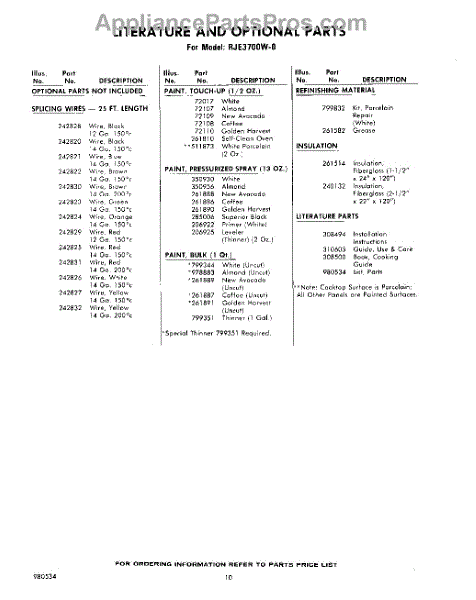 Parts for Whirlpool RJE3700W0: 10 - Lit / Optional Parts