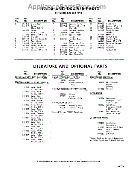 Parts for Whirlpool RJE953PP0: 03 - Lit / Optional Parts
