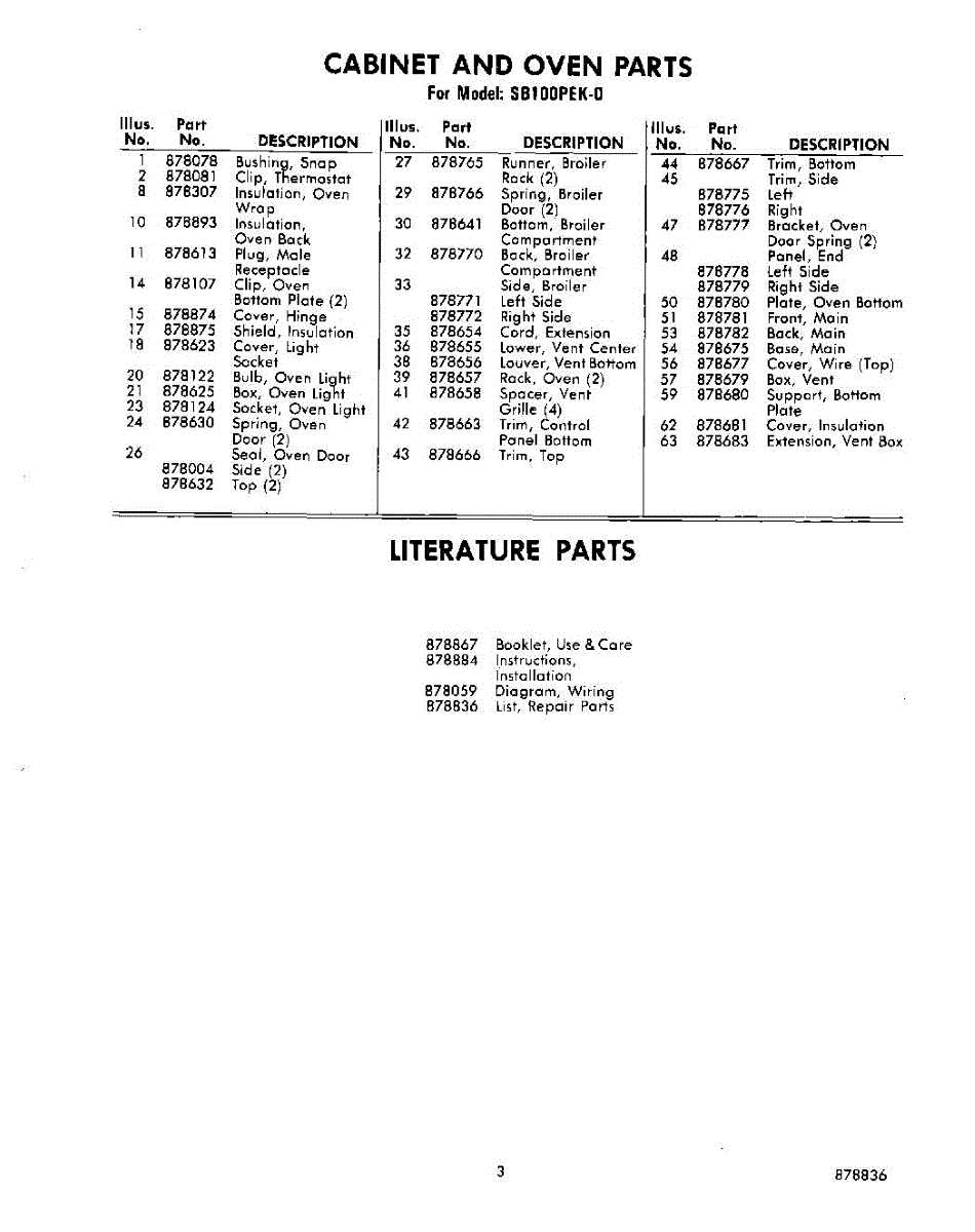 Parts for Whirlpool SB100PEK0: 03 - Lit / Optional Parts