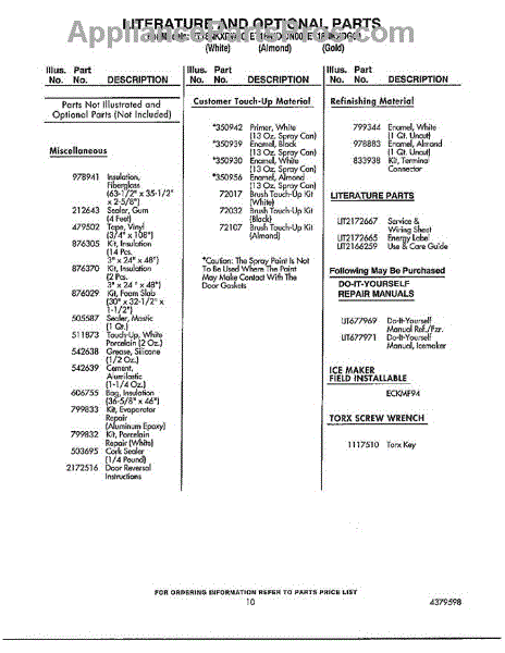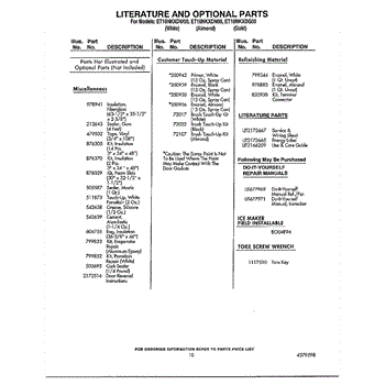 Parts for Whirlpool ET18NKDN00: Literature And Optional Parts