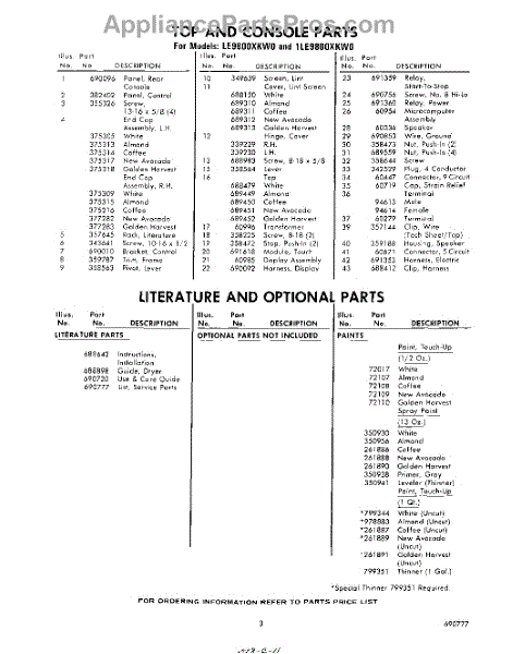 Parts for Whirlpool LE9800XKW0: 03 - Literature And Optional Parts