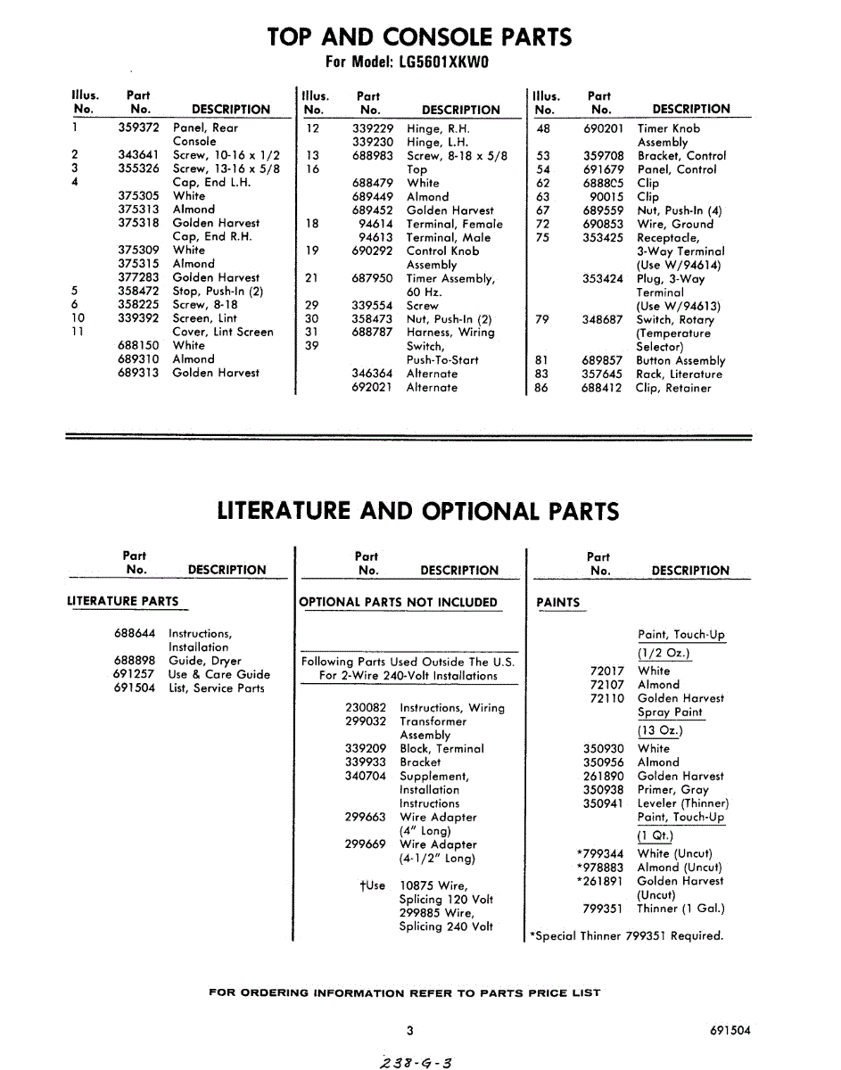 Parts for Whirlpool LG5601XKW0: 03 - Literature And Optional Parts