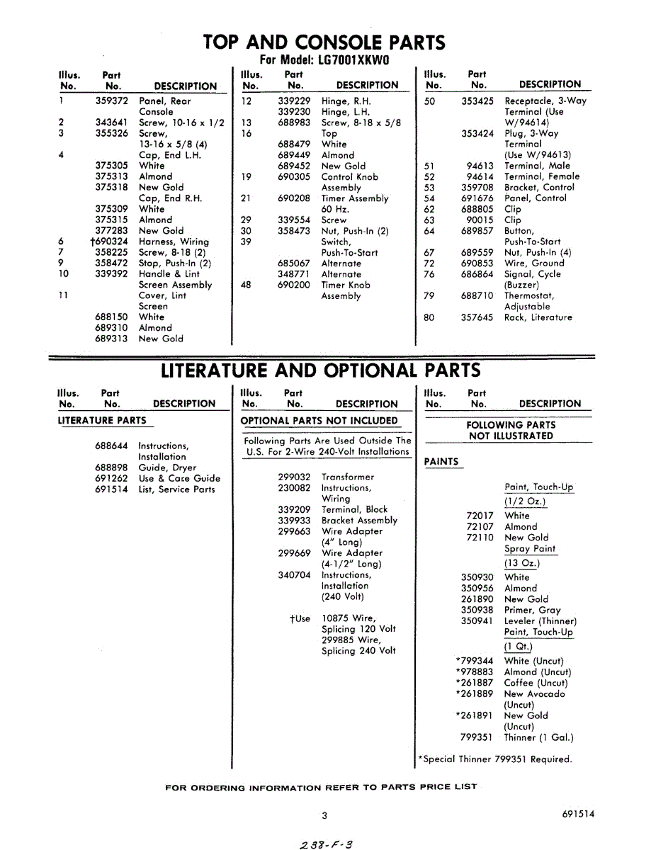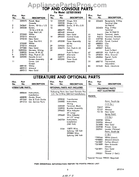Parts for Whirlpool LG7001XKW0: 03 - Literature And Optional Parts