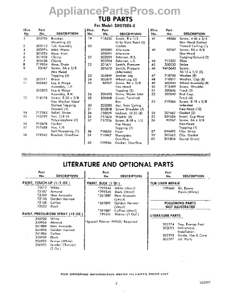 Parts for Whirlpool SHU70040: 03 - Literature And Optional Parts
