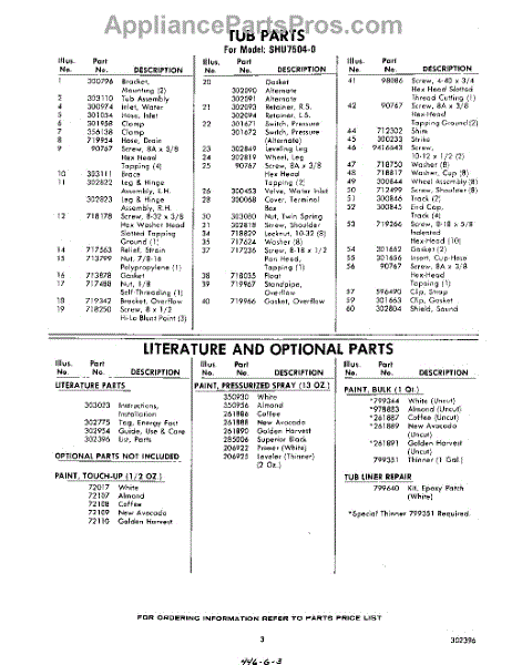 Parts for Whirlpool SHU75040: 03 - Literature And Optional Parts