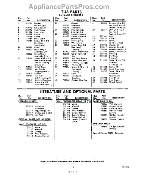 Parts for Whirlpool SHU80040: 03 - Literature And Optional Parts
