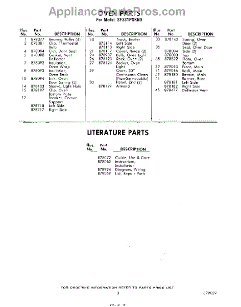 Parts for Whirlpool SF331PSKN0: 03 - Literature Parts