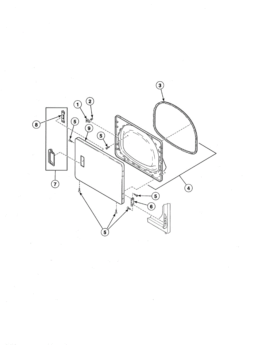 Complete dryer door assembly that mounts to the front panel. Replace if your door is cracked, damaged, or won't close properly. Includes hinges and latch.