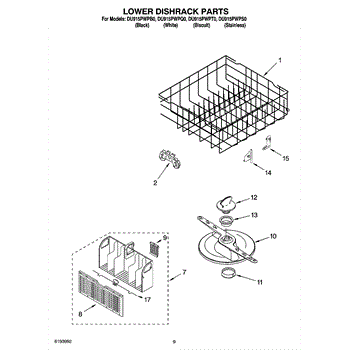 Replacement wheel assembly for dishwasher lower rack. Snaps onto rack to allow smooth gliding along tracks. Replace if cracked, broken, or missing.