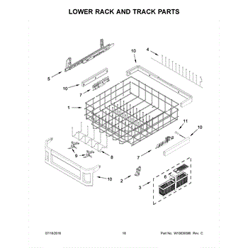 This left-hand dishrack support mounts to the rack/rail assembly to hold the rack level and guide it in and out. Replacing a worn support restores smooth rack travel and proper alignment to prevent binding, sagging, or derailment.