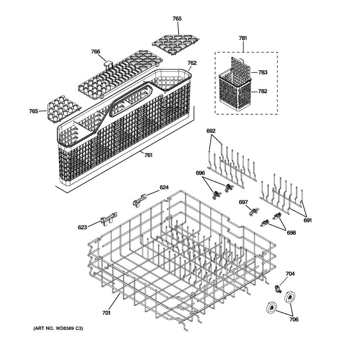 Replacement silverware basket for dishwashers. Holds utensils and flatware securely during wash cycles. Needed when original basket is cracked or broken.