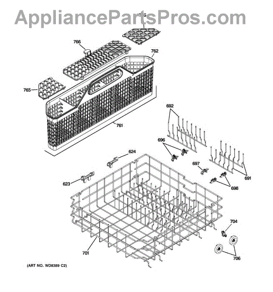 The Silverware Basket is an OEM part for GE dishwashers that is responsible for holding and organizing silverware for washing, this basket ensures that utensils are effectively cleaned and maintained. The basket measures about: 3 inches wide, 9 inches high, 19 inches deep. For the seven-piece silverware basket, order part number WD28X24469.