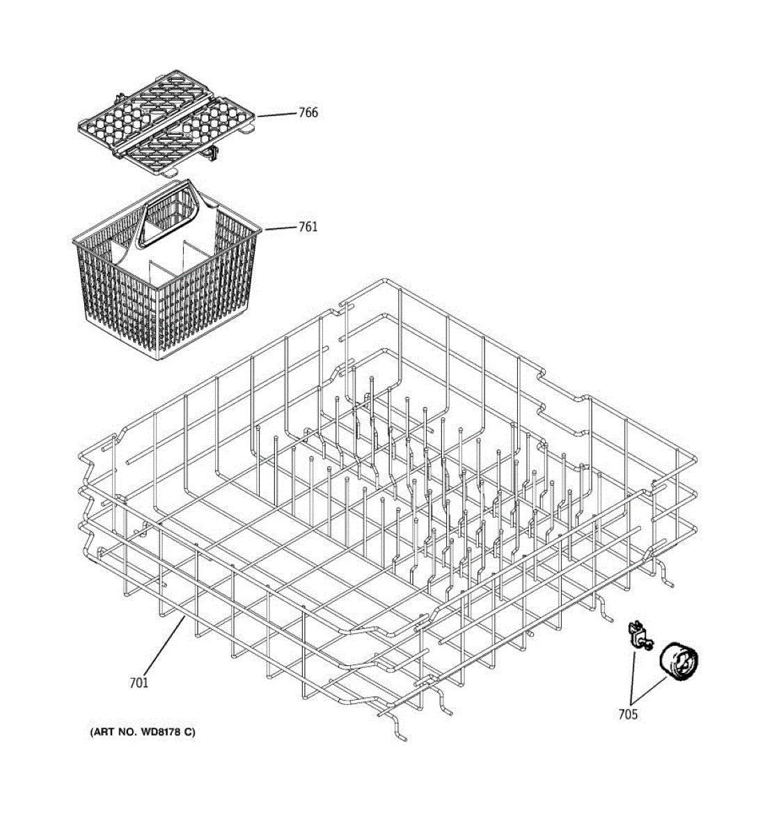 Replacement silverware basket with handle for your dishwasher. Needed when original basket is cracked, broken, or has worn holes that let utensils fall through.