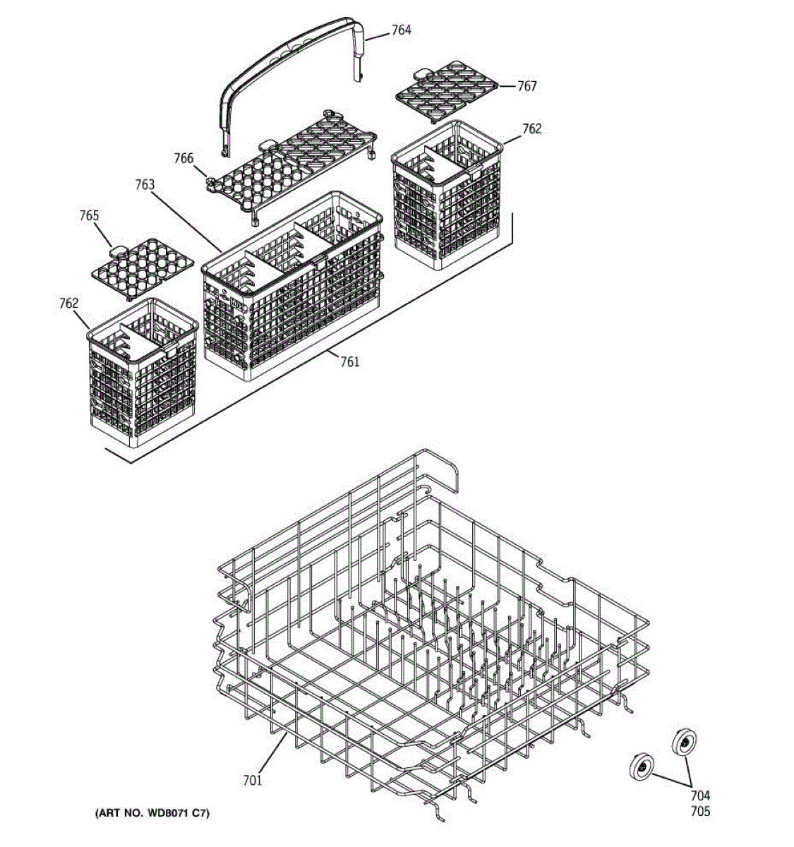 Replacement silverware basket for dishwashers. Holds utensils and flatware securely during wash cycles. Needed when original basket is cracked or broken.