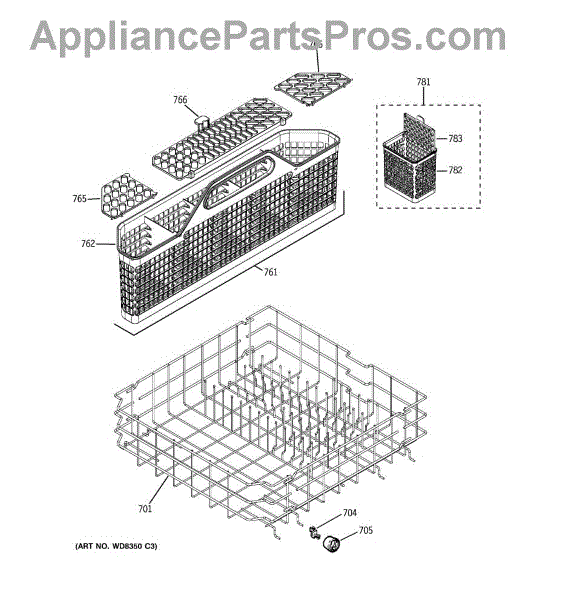 The Silverware Basket is an OEM part for GE dishwashers that is responsible for holding and organizing silverware for washing, this basket ensures that utensils are effectively cleaned and maintained. The basket measures about: 3 inches wide, 9 inches high, 19 inches deep. For the seven-piece silverware basket, order part number WD28X24469.