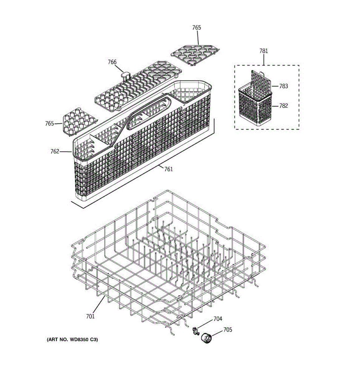Replacement silverware basket for dishwashers. Holds utensils and flatware securely during wash cycles. Needed when original basket is cracked or broken.