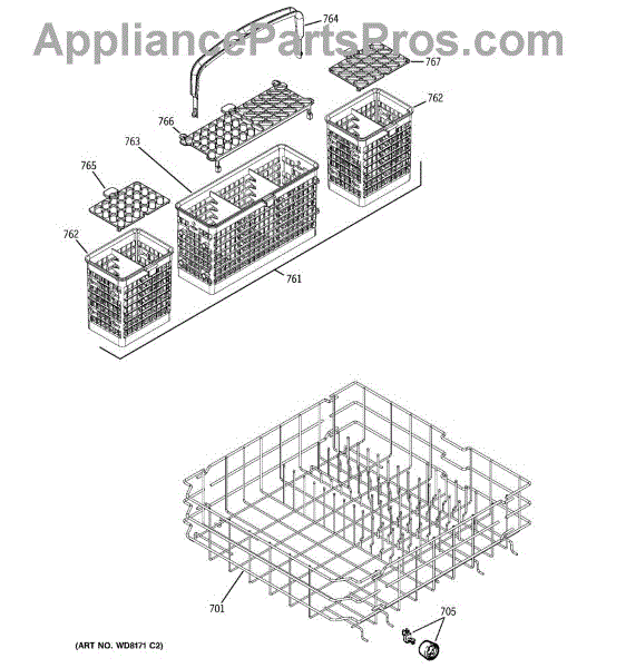 Replacement silverware basket for dishwashers. Holds utensils and flatware securely during wash cycles. Needed when original basket is cracked or broken.