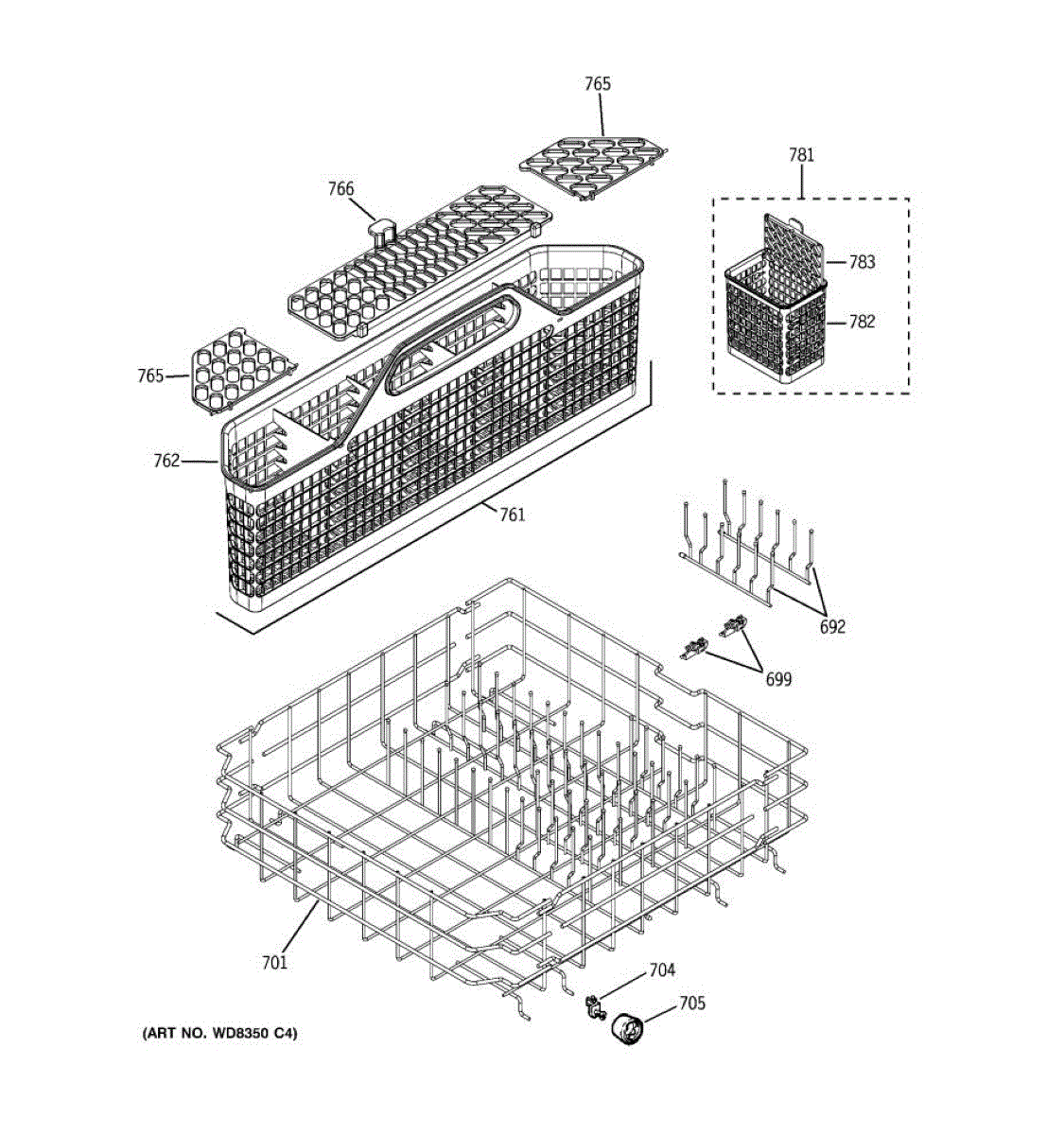 Replacement silverware basket for dishwashers. Holds utensils and flatware securely during wash cycles. Needed when original basket is cracked or broken.