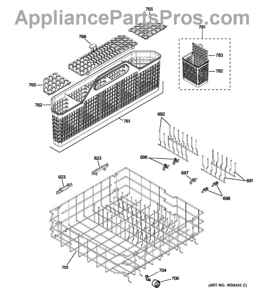The Silverware Basket is an OEM part for GE dishwashers that is responsible for holding and organizing silverware for washing, this basket ensures that utensils are effectively cleaned and maintained. The basket measures about: 3 inches wide, 9 inches high, 19 inches deep. For the seven-piece silverware basket, order part number WD28X24469.