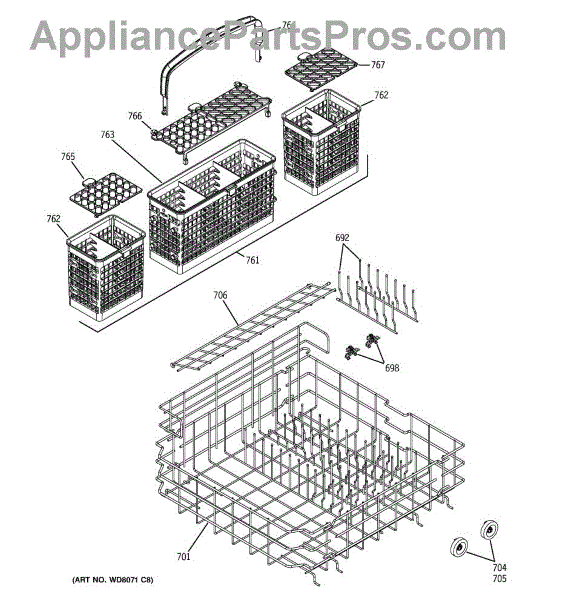 The Silverware Basket Assembly is an OEM replacement part for GE dishwashers. It is a specialized basket designed to hold and secure utensils, flatware, and other small items during the dishwashing cycle. It is important to note that if your original basket was a 3-piece design, the manufacturer has updated this part to a more convenient 1-piece design
