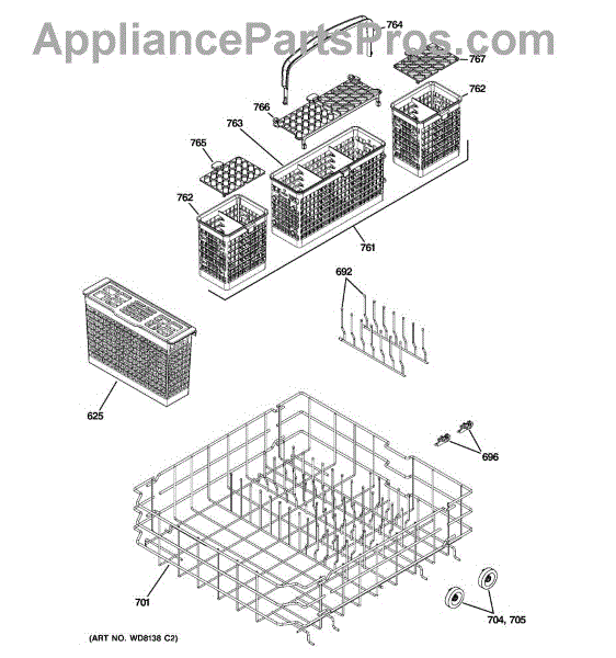 The Silverware Basket is an OEM component specifically designed for GE dishwashers. It provides a separator zone to organize knives, forks, and spoons for effective cleaning. Plastic baskets endure exposure to hot water and chemicals with each cycle. Over years of usage, the plastic material can weaken or crack.