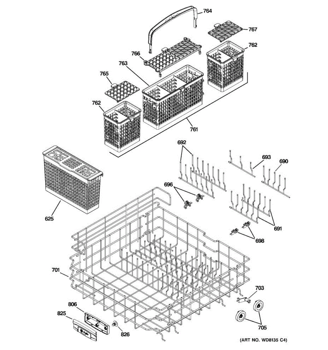 Replacement silverware basket for dishwashers. Holds utensils and flatware securely during wash cycles. Needed when original basket is cracked or broken.