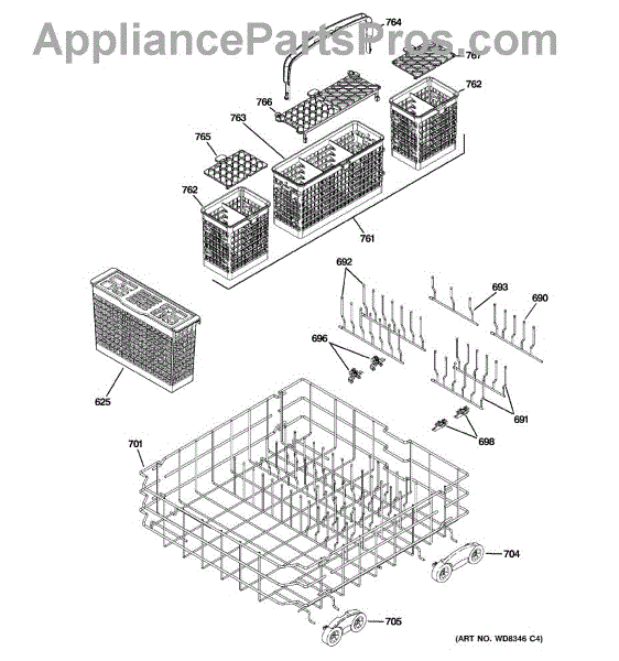 The Silverware Basket is an OEM component specifically designed for GE dishwashers. It provides a separator zone to organize knives, forks, and spoons for effective cleaning. Plastic baskets endure exposure to hot water and chemicals with each cycle. Over years of usage, the plastic material can weaken or crack.