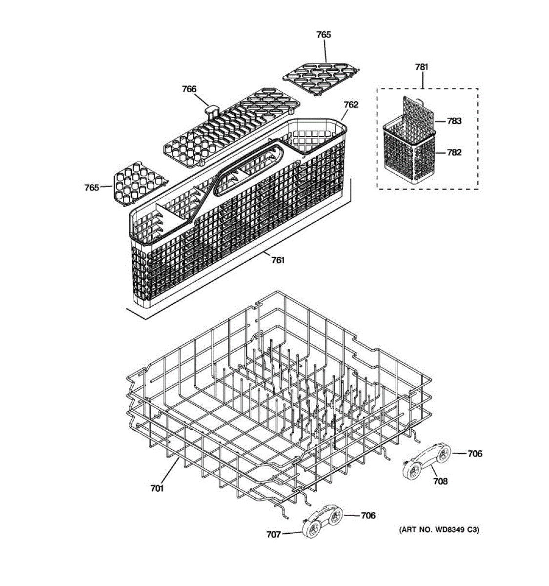 Replacement silverware basket for dishwashers. Holds utensils and flatware securely during wash cycles. Needed when original basket is cracked or broken.