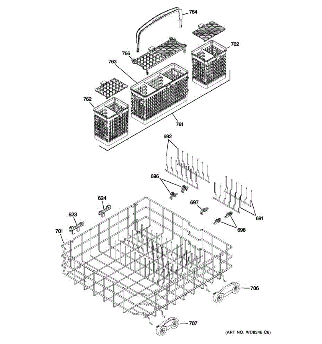 Replacement silverware basket for dishwashers. Holds utensils and flatware securely during wash cycles. Needed when original basket is cracked or broken.