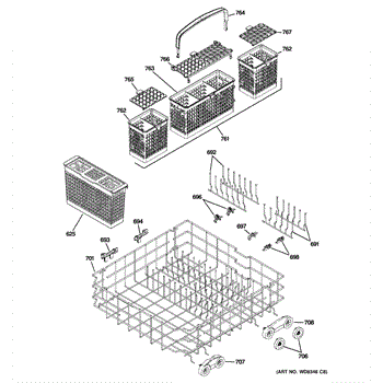 The Silverware Basket is an OEM component specifically designed for GE dishwashers. It provides a separator zone to organize knives, forks, and spoons for effective cleaning. Plastic baskets endure exposure to hot water and chemicals with each cycle. Over years of usage, the plastic material can weaken or crack.