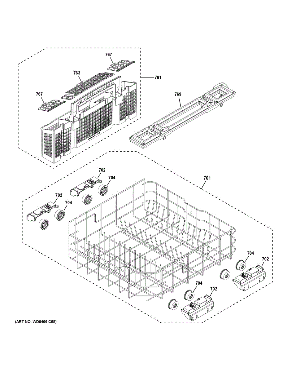 Replacement silverware basket for dishwashers. Holds utensils and flatware securely during wash cycles. Needed when original basket is cracked or broken.