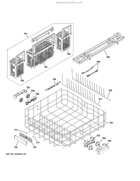 This silverware basket assembly with rail replaces a damaged or missing utensil holder in your dishwasher. It keeps flatware organized and secure on the lower rack, preventing pieces from slipping through and helping ensure thorough cleaning.