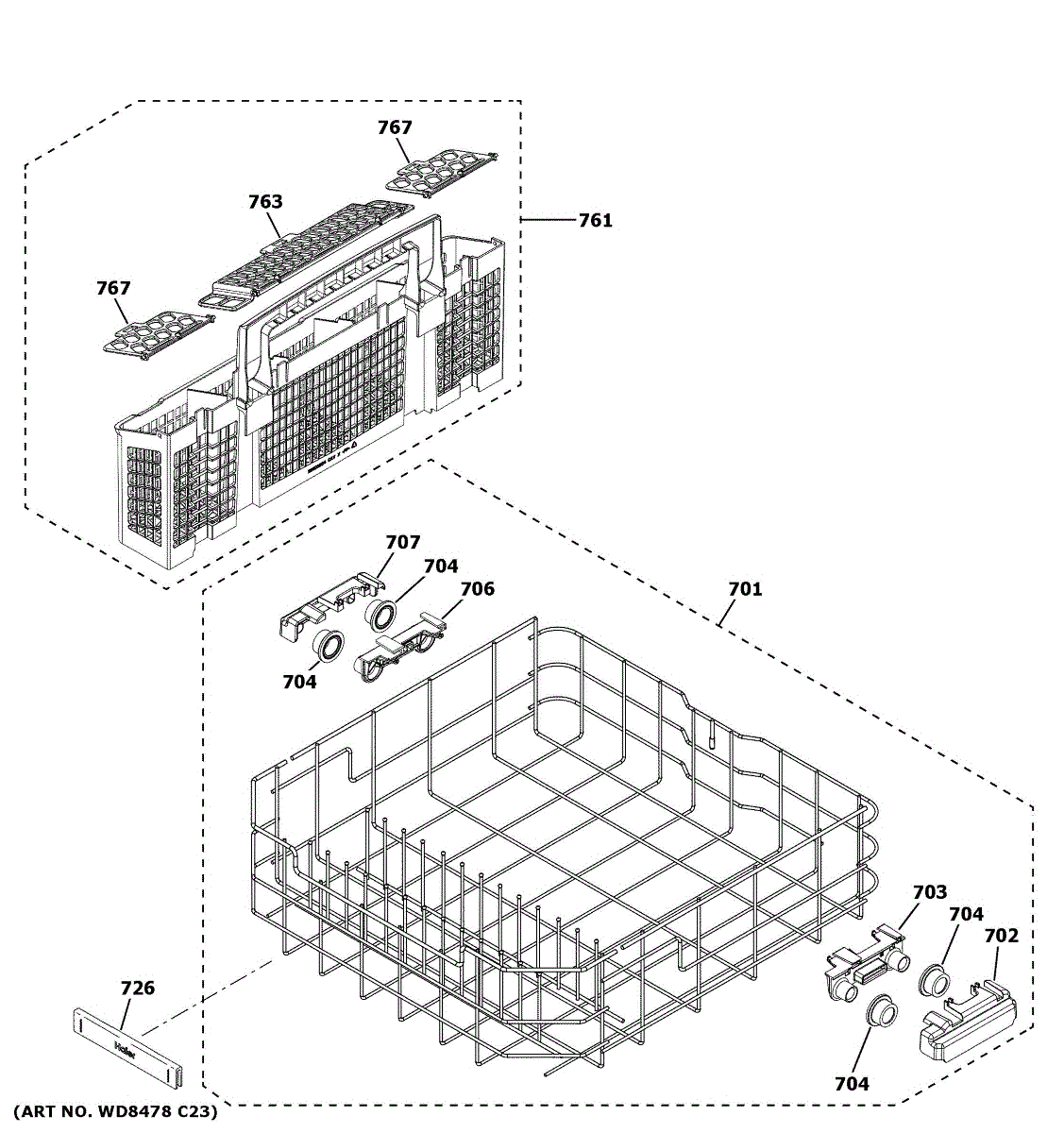 Replacement silverware basket for dishwashers. Holds utensils and flatware securely during wash cycles. Needed when original basket is cracked or broken.