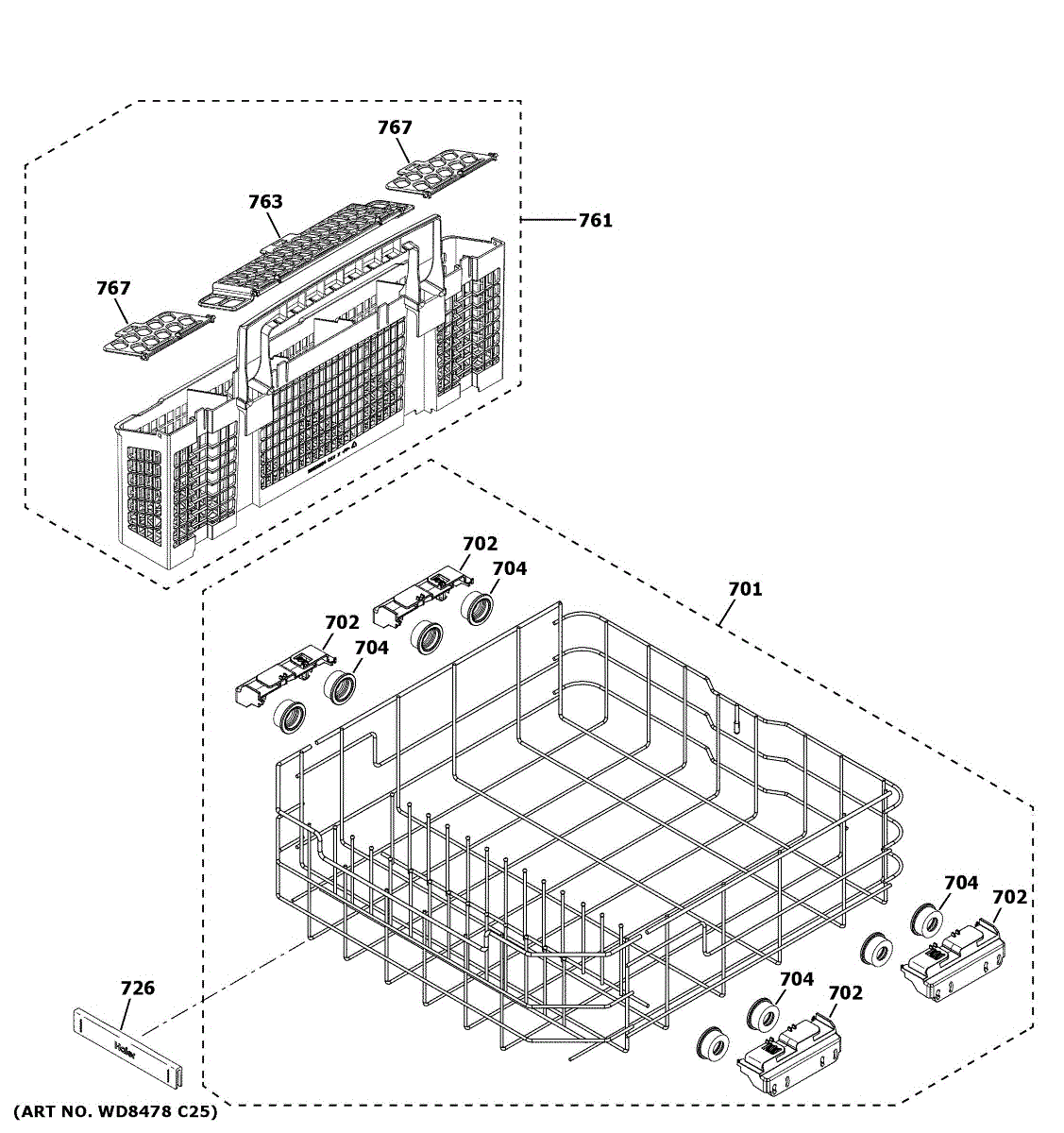 Replacement silverware basket for dishwashers. Holds utensils and flatware securely during wash cycles. Needed when original basket is cracked or broken.