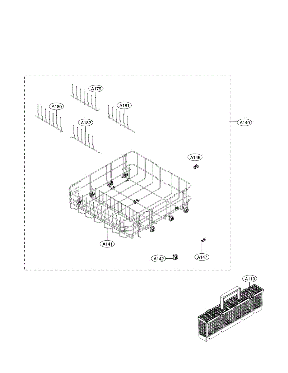 The Rack Assembly is an OEM replacement part for LG dishwashers. It is the lower dish rack used to store and hold dishes during all wash cycles. Causes of a faulty rack assembly can be damage such as cracks or broken wires, especially after extended use or improper loading that puts excess strain on the components. Symptoms of a bad rack assembly include: