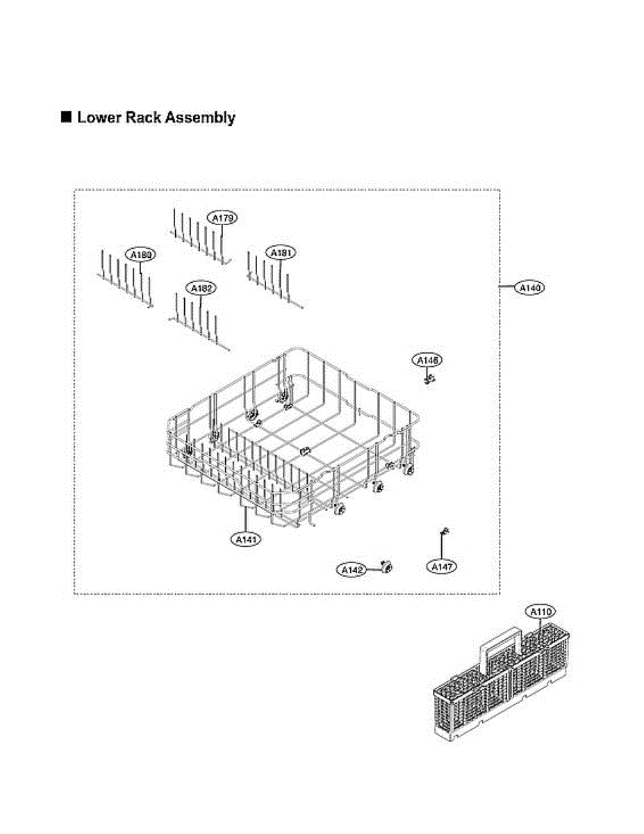 Lower rack assembly for dishwashers. Holds dishes, utensils, and cookware during wash cycles. Replace if cracked, broken, or wheels are worn or missing.