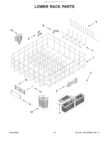This is the dishwasher silverware basket that organizes and secures utensils in the lower rack for effective spray coverage. Replace a cracked, warped, or missing basket to restore proper loading, protect small items, and maintain consistent cleaning results. What it does: