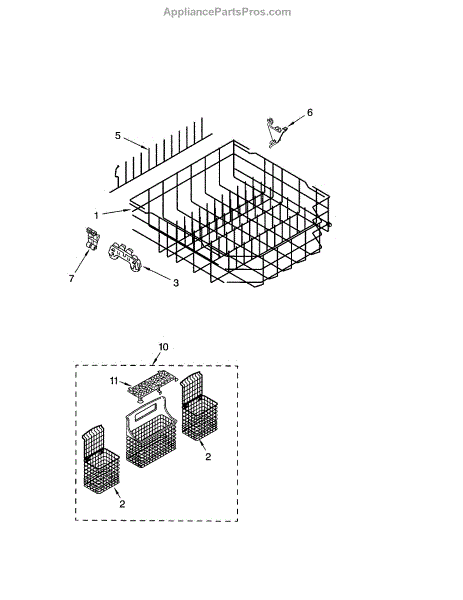 Replacement silverware basket for your dishwasher's lower rack. Organizes forks, knives, and spoons during wash cycles. Needed when original is cracked or broken.