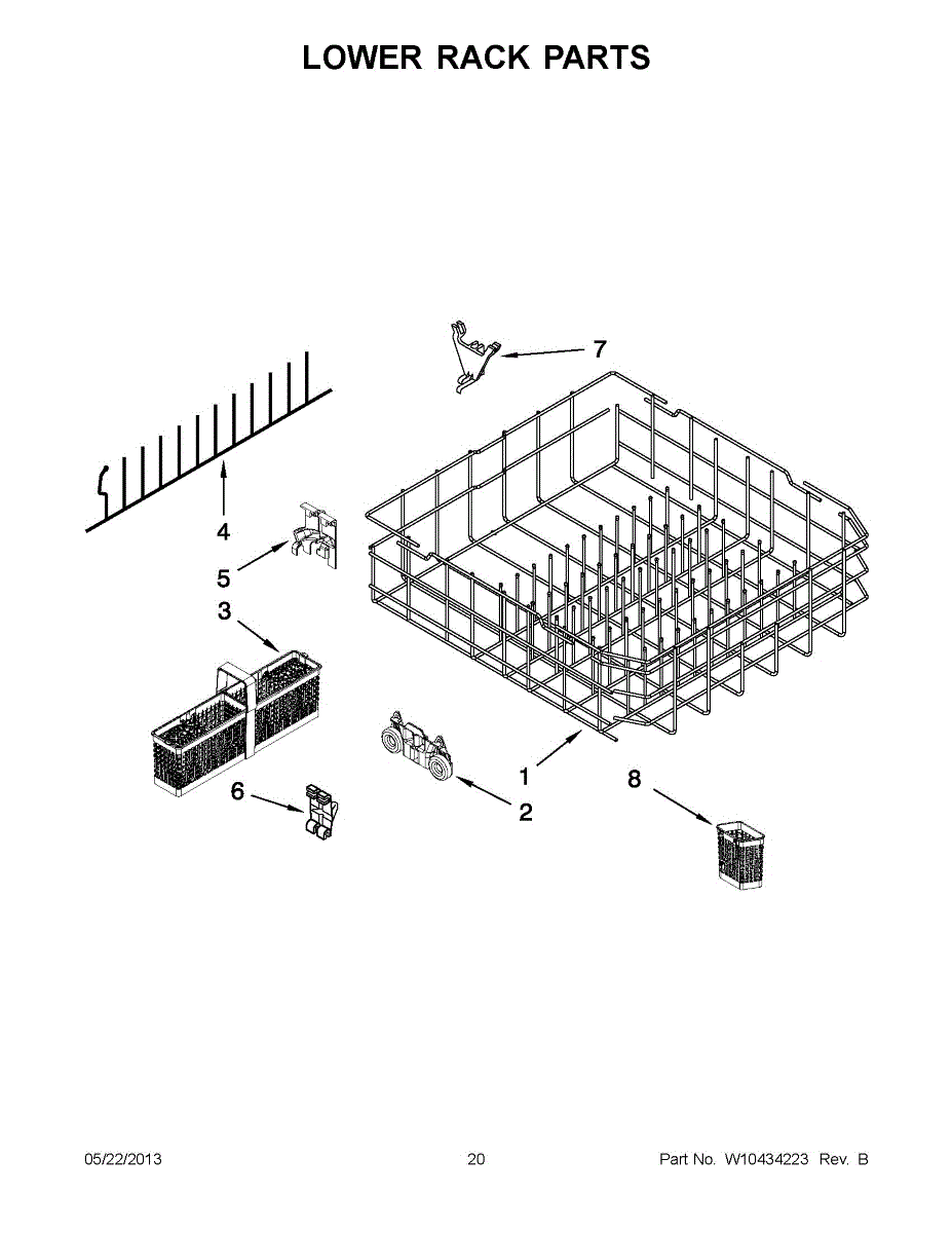 Replacement lower dishrack for dishwashers. Holds dishes, pots, and pans during wash cycles. Replace if cracked, rusted, or tines are broken or missing.