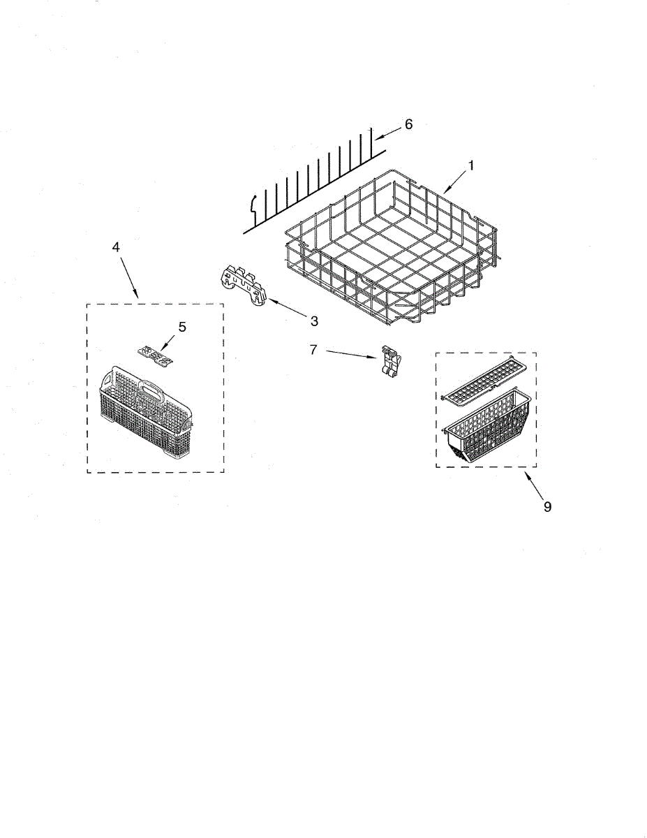 Holds utensils and cutlery in the lower rack during wash cycles. Replace if bottom is cracked, broken, has holes, or compartments are damaged or missing.