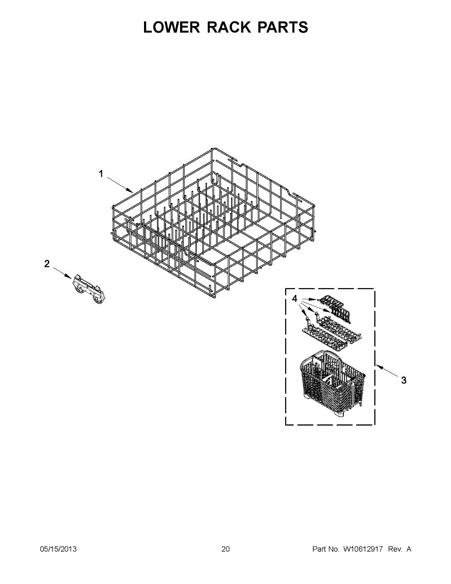 Replacement silverware basket for dishwasher. Installs on lower rack to hold utensils. Needed when original is cracked, broken, or has holes in bottom.